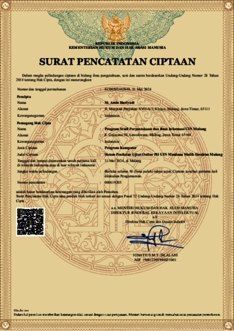 - Sistem Penilaian Ujian Online PII UIN Maulana Malik Ibrahim Malang (sertifikat hak cipta). (deposited 01 Jul 2024 11:37) [Currently Displayed]