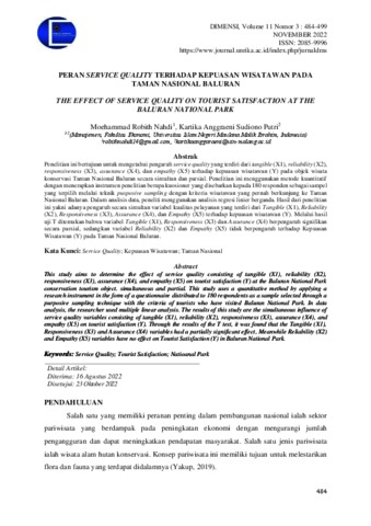 Penelitian ini bertujuan untuk mengetahui pengaruh kualitas pelayanan yang terdiri dari tangible (X1), reliability (X2), responsiveness (X3), assurance (X4), dan empathy (X5) terhadap kepuasan wisatawan (Y) pada objek wisata konservasi Taman Nasional Baluran secara simultan dan parsial. Penelitian ini menggunakan metode kuantitatif dengan menerapkan instrumen penelitian berupa kuosioner yang disebarkan kepada 180 responden sebagai sampel yang terpilih melalui teknik pusposive sampling dengan kriteria wisatawan yang pernah berkunjung ke Taman Nasional Baluran. Dalam analisis data, peneliti menggunakan analisis regresi linier berganda. Hasil dari penelitian ini yakni adanya pengaruh secara simultan variabel kualitas pelayanan yang terdiri dari tangible (X1), reliability (X2), responsiveness (X3), assurance (X4), dan empathy (X5) terhadap kepuasan wisatawan (Y). Melalui hasil uji T ditemukan bahwa variabel Tangible (X1), Responsiveness (X3) dan Assurance (X4) berpengaruh signifikan secara parsial. sedangkan, variabel Reliability (X2) dan Empathy (X5) tidak berpengaruh terhadap Kepuasan Wisatawan (Y) pada Taman Nasional Baluran