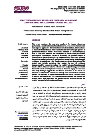 This study analyses the strategies employed by female characters, particularly Aminah in Ibrahim Nasrallah's novel A'ros Aminah, to resist and challenge the oppressive characteristics of Israeli colonialism. The resistance is demonstrated by female characters in the novel from the perspective of postcolonial feminist studies. Postcolonial feminism is a multidisciplinary area of study that examines the convergence of feminist and postcolonial philosophies. The analysis centers on examining the profound impact of colonialism on the marginalization of women's dignity. This study utilizes a descriptive qualitative research methodology to analyze the behaviors and resistance of Aminah and other female characters in novel narratives. The study's data include quotations that portray the acts of resistance demonstrated by women throughout the conflict between Palestinian and Israeli soldiers. The quotes in the collection are analyzed using postcolonial feminist theory to investigate how women in the novel engage in resistance. The study findings suggest that the female characters in the novel are depicted as independent women who actively work towards their survival, possess the capability to support their families, and exhibit a distinct ability to oppose the Israeli army. The research findings indicate that women can actively resist and counteract the oppression that occurred during the conflict between the Palestinians and Israel.