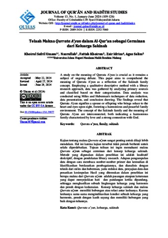 Umam, Khoirul Safril, Nasrulloh, Nasrulloh, Khoiron, Fattah, Idrisa, Zair and Salim, Agus (2024) Telaah makna Qurrata A’yun dalam Al-Qur’an sebagai cerminan dari keluarga sakinah. Journal of Qur'an and Hadith Studies, 13 (1). pp. 109-126. ISSN 22527060
