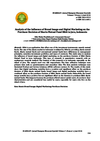 Bibit is an application that offers one of the investment instruments, namely mutual funds. The size of the sharia market in Indonesia is utilized by Bibit by providing sharia mutual funds. Sharia mutual funds and conventional mutual funds have differences in management principles, securities investment portfolios, and types of contracts. This study aims to analyze the influence of brand image and digital marketing on the purchase decision of Bibit Sharia Mutual Fund in Java, Indonesia. This type of research is quantitative research with an explanatory research method. The location of this research is in Indonesia, especially on the island of Java. The sample used was 180 respondents. The data collection technique uses primary data such as questionnaires and secondary data. The data analysis technique uses Statistical Product and Service Solutions (SPSS) software version 25. The results of this study show that digital marketing variables have a positive and significant effect on the purchase decision of Bibit sharia mutual funds, brand image and digital marketing variables have a combined effect on the purchase decision of Bibit sharia mutual funds. Meanwhile, the brand image variable has a positive but not significant effect on the decision to purchase Bibit sharia mutual funds. This happens because the products offered cannot satisfy users, do not have clear characteristics and are considered less useful by users, especially for users who live on the island of Java.