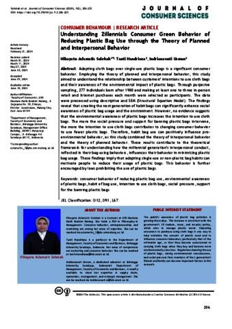 | Keywords: | consumer behavior of reducing plastic bag use; environmental awareness of plastic bags, habit of bag use, intention to use cloth bags, social pressure, support for the banning plastic bags |