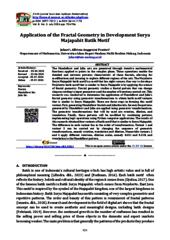 The Mandelbrot and Julia sets are generated through iterative mathematical functions applied to points in the complex plane. These operations enable the detailed and intricate patterns characteristic of these fractals, allowing for modifications and zooming to explore different regions of the sets. TThe Mojokerto Surya Majapahit batik motif is a motif that has eight corners. One way to develop a Mojokerto batik motif that is similar to Surya Majapahit is by applying the science of fractal geometry. Fractal geometry studies a fractal pattern that can change shape according to input parameters and the number of iterations carried out. This research was conducted to determine the application of Mandelbrot and Julia’s fractal geometry using geometric transformations to obtain batik motif variants that is similar to Surya Majapahit. There are three steps in forming this motif variant. First, generating Mandelbrot fractals and Julia fractals. Second, the patterns generated by Mandelbrot and Julia are applied using geometric transformations. The geometric transformations that will be used are rotation, dilation, and translation. Finally, these patterns will be modified by combining patterns implementing logic operations using Python computer applications. The results of this research obtained four variants of batik motif that is similar to Surya Majapahit. The difference in each variant lies in the order of transformation. Variant 1 and variant 3 can be carried out by changing the sequence of geometric transformations, namely rotation, translation and dilationVariant 1 is obtained by applying rotation, dilation, and translation to the Mandelbrot and Julia pattern. Variant 2 is obtained with the Mandelbrot pattern applying rotation, dilation with two different scales, and translation, while the Julia pattern only applied rotation and translation. Variant 3 is obtained by applying rotation, dilation and translation to the Mandelbrot and Julia pattern. Variant 4 is obtained with the Mandelbrot pattern applied by rotation, dilation with three different scales, and translation, while the Julia pattern was applied only by rotation and translation. Meanwhile variants 2 and 4 apply different rotations, dilation scales, namely 0.451 and 0.318, and translation to the Mandelbrot pattern