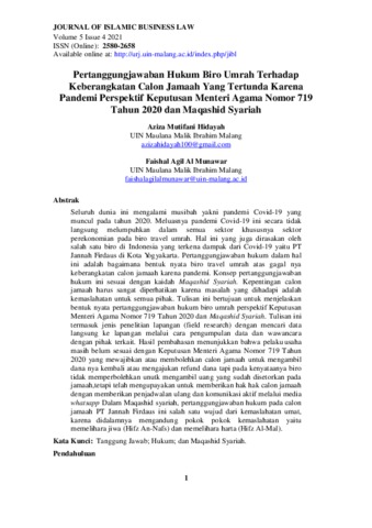 Seluruh dunia ini mengalami musibah yakni pandemi Covid-19 yang muncul pada tahun 2020. Meluasnya pandemi Covid-19 ini secara tidak langsung melumpuhkan dalam semua sektor khususnya sektor perekonomian pada biro travel umrah. Hal ini yang juga dirasakan oleh salah satu biro di Indonesia yang terkena dampak dari Covid-19 yaitu PT Jannah Firdaus di Kota Yogyakarta. Pertanggungjawaban hukum dalam hal ini adalah bagaimana bentuk nyata biro travel umrah atas gagal nya keberangkatan calon jamaah karena pandemi. Konsep pertanggungjawaban hukum ini sesuai dengan kaidah Maqashid Syariah. Kepentingan calon jamaah harus sangat diperhatikan karena masalah yang dihadapi adalah kemaslahatan untuk semua pihak. Tulisan ini bertujuan untuk menjelaskan bentuk nyata pertanggungjawaban hukum biro umrah perspektif Keputusan Menteri Agama Nomor 719 Tahun 2020 dan Maqashid Syariah. Tulisan ini termasuk jenis penelitian lapangan (field research) dengan mencari data langsung ke lapangan melalui cara pengumpulan data dan wawancara dengan pihak terkait. Hasil pembahasan menunjukkan bahwa pelaku usaha masih belum sesuai dengan Keputusan Menteri Agama Nomor 719 Tahun 2020 yang mewajibkan atau membolehkan calon jamaah untuk mengambil dana nya kembali atau mengajukan refund dana tapi pada kenyataanya biro tidak memperbolehkan untuk mengambil uang yang sudah disetorkan pada jamaah, tetapi telah mengupayakan untuk memberikan hak-hak calon jamaah dengan memberikan penjadwalan ulang dan komunikasi aktif melalui media whatsapp. Dalam Maqashid syariah, pertanggungjawaban hukum pada calon jamaah PT Jannah Firdaus ini salah satu wujud dari kemaslahatan umat, karena didalamnya mengandung pokok pokok kemaslahatan yaitu memelihara jiwa (Hifz An-Nafs) dan memelihara harta (Hifz Al-Mal).