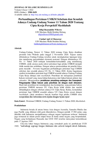 Undang-Undang Nomor 11 Tahun 2020 tentang Cipta Kerja disahkan presiden Joko Widodo pada tanggal 2 November 2020. Tujuan utama dibentuknya Undang-Undang tersebut untuk meningkatkan lapangan kerja dan mendorong pertumbuhan ekonomi nasional. Dengan dibentuknya UU No. 11 Tahun 2020 terdapat kemudahan-kemudahan yang mendukung UMKM, salah satunya pada sektor perizinan bagi pelaku UMKM menjadi lebih mudah dan sederhana. Dengan adanya permasalahan ini peneliti fokus pada masalah : Pertama bagaimana perbandingan perizinan bagi UMKM sebelum dan sesudah adanya UU No. 11 Tahun 2020. Kedua bagaimana analisis kemudahan perizinan bagi UMKM sesudah adanya Undang-Undang Cipta Kerja ditinjau dari mashlahah. Penelitian ini merupakan penelitian hukum normatif yang mana bahan hukumnya dari bahan hukum primer dan sekunder. Menggunakan pendekatan perundang-undangan dan konseptual. Pengumpulan bahan hukum pada penelitian ini dengan studi dokumen. Hasil dari penelitian ini mendapatkan dua kesimpulan, yang pertama bahwa perizinan UMKM menurut UU Cipta Kerja lebih efisien dan mudah dibandingkan dengan sebelum adanya UU Cipta Kerja. Kedua, kemudahan perizinan bagi UMKM sesudah adanya UU Cipta Kerja sesuai dengan mashlahah, yakni membawa banyak manfaat bagi pelaku UMKM serta menjauhkan dari keburukan serta sejalan dengan tujuan syara’.