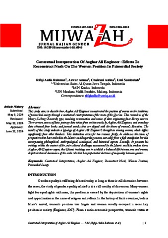 Rahman, Rifqi Aulia, Annas, Azwar, Astina, Chairani and Sumbulah, Umi (2024) Contextual interpretation of Asghar Ali Engineer: Efforts to Reconstruct Nash on the women position in primordial society. Muwazah: Jurnal Kajian Gender, 16 (1). ISSN 2085-8353 ; E-ISSN 2502-5368