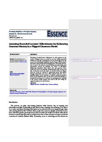 Mubarok, Ahsin Fahmi, Hamidah, Fitria Nur, Salim, Mochammad Abdullah and Yuniar, Rendhi Fatrisna (2024) Assessing recorded lectures’ effectiveness for enhancing grammar mastery in a flipped classroom model. Essence; Teaching English as Foreign Language, Linguistics, and Literature Journal, 1 (1). pp. 1-8. ISSN xxxx-xxxx