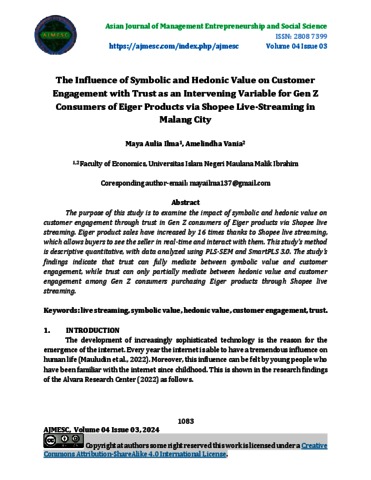The influence of symbolic and hedonic value on customer engagement with trust as an intervening variable for Gen Z consumers of Eiger products via Shopee live-streaming in Malang City.