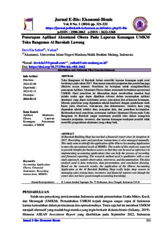 Savitri, Devi Ela and Yuliati, Yuliati (2024) Penerapan aplikasi akuntansi Olsera pada laporan keuangan UMKM Toko Bangunan Al Barokah Lawang. Jurnal E-Bis: Ekonomi Bisnis, 8 (1). pp. 321-332. ISSN 2622-3368