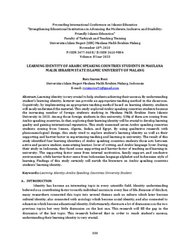 Rosi, Rois Imron (2023) Learning identity of Arabic speaking countries students in Maulana Malik Ibrahim State Islamic University of Malang. Presented at International Conference on Islamic Education (ICIED) 2023, 10 Nov 2023, Malang.
