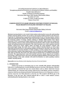 Learning identity is very crucial to help students achieving their success. By understanding student’s learning identity, lecturer can provide an appropriate teaching method in the classroom. Cognitively, by implementing an appropriate teaching method based on learning identity, students will easily understand the material. This study explored Arabic speaking countries students because the increasing number of foreign students studying in Maulana Malik Ibrahim State Islamic University in 2023. Among those foreign students in this university, 52% of them are coming from Arabic speaking countries. So that, exploring their learning identity will be crucial to develop learning quality and gaining international reputation. This study examined seven Arabic speaking countries students coming from Yemen, Algeria, Sudan, and Egypt. By using qualitative research with phenomenological design, this study tried to explore student’s learning identity as well as their supporting and barrier factor in experiencing teaching and learning in university. The result of this study identified four learning identities of Arabic speaking countries students those are: between active and passive student, memorizing learner, lover of writing, and Arabic language lover. During their study in Indonesia, they faced some supporting and barrier factor of teaching and learning in university. The supporting factor came from internal motivation, family support, and conducive environment, while barrier factor came from Indonesian language alphabet and Indonesian style of learning. Findings of this study certainly will enrich the literature on Arabic speaking countries students’ learning identity.