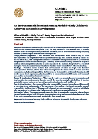 Design/methods/approach – This research and development study utilized Borg & Gall's development model, simplified for efficiency in terms of energy, time, and cost. The study focused on the validation stage, with testing and dissemination planned for subsequent research. The product was designed based on an initial needs analysis. Currently, environmental learning is limited to cognitive abilities only, lacking additional skills or habits imparted to the children. The product was validated through a Forum Discussion Group with Jakarta Bisa School and Gaharu Nature School in Bandung.
