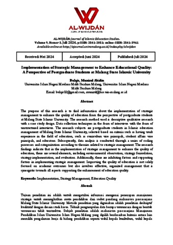 Bulqis, Bulqis and Abidin, Munirul (2024) Implementation of strategic management to enhance educational quality: A perspective of postgraduate students at Malang State Islamic University. AL-WIJD�N: Journal of Islamic Education Studies, 9 (3). pp. 320-333. ISSN p-2541-2051 /e-2541-3961