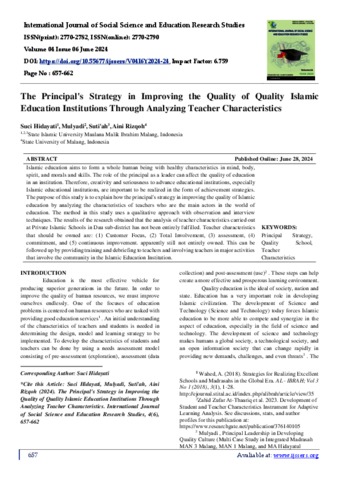 Hidayati, Suci, Mulyadi, Mulyadi, Sutiah, Sutiah and Rizqoh, Aini (2024) The principal’s strategy in improving the quality of quality Islamic education institutions through analyzing teacher characteristics. International Journal of Social Science and Education Research Studies, 4 (6). pp. 657-662. ISSN 27702782 (p.); 27702790 (e.)