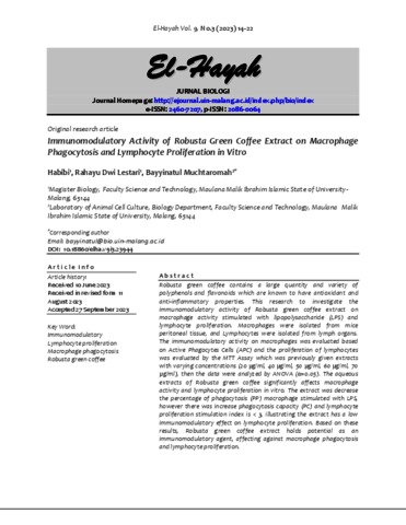 Robusta green coffee contains a large quantity and variety of polyphenols and flavonoids which are known to have antioxidant and anti-inflammatory properties. This research to investigate the immunomodulatory activity of Robusta green coffee extract on macrophage activity stimulated with lipopolysaccharide (LPS) and lymphocyte proliferation. Macrophages were isolated from mice peritoneal tissue, and Lymphocytes were isolated from lymph organs. The immunomodulatory activity on macrophages was evaluated based on Active Phagocytes Cells (APC) and the proliferation of lymphocytes was evaluated by the MTT Assay which was previously given extracts with varying concentrations (20 µg/ml, 40 µg/ml, 50 µg/ml, 60 µg/ml, 70 µg/ml), then the data were analyzed by ANOVA (α=0.05). The aqueous extracts of Robusta green coffee significantly affects macrophage activity and lymphocyte proliferation in vitro. The extract was decrease the percentage of phagocytosis (PP) macrophage stimulated with LPS, however there was increase phagocytosis capacity (PC) and lymphocyte proliferation stimulation index is < 3, illustrating the extract has a low immunomodulatory effect on lymphocyte proliferation. Based on these results, Robusta green coffee extract holds potential as an immunomodulatory agent, affecting against macrophage phagocytosis and lymphocyte proliferation.