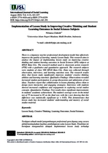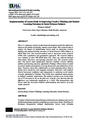 Zuhroh, Ni’matuz (2024) Implementation of lesson study in improving creative thinking and student learning outcomes in social sciences subjects. International Journal of Social Learning (IJSL), 4 (3). pp. 421-437. ISSN 2774-8359