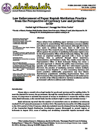Please refrain from mutilating paper currency as it is dangerous and can lead to counterfeiting. This undermines economic stability and reflects weaknesses in law enforcement. Although efforts have been made to address this issue, there is still room for improvement. This research aims to investigate law enforcement efforts against the practice of mutilating Indonesian rupiah notes by the Representative Office of Bank Indonesia Malang. The study adopts an empirical juridical approach with a focus on legal sociology. Data is gathered through direct interviews, documentation, and literature study. The results reveal that the Representative Office of Bank Indonesia Malang has taken a proactive approach to educate the public, raise awareness, issue appeals, and collaborate with other law enforcement agencies. However, the practice of mutilating currency violates multiple provisions of Law Number 7 of 2011 concerning Currency and incurs penalties. Additionally, perpetrators may face Islamic discretionary punishment, including imprisonment, fines, and other measures. This comprehensive legal framework underscores the severity of the offenses related to currency mutilation and the government's efforts to address such violations.