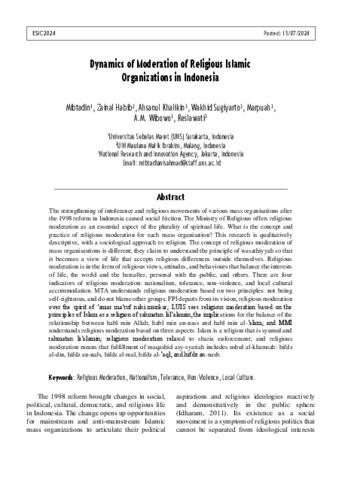 Mibtadin, Mibtadin, Habib, Zainal, Khalikin, Ahsanul, Sugiyarto, Wakhid, Marpuah, Marpuah, Wibowo, A.M. and Reslawati, Reslawati (2024) Dynamics of moderation of religious Islamic organizations in Indonesia. Evolutionary Studies in Imaginative Culture, 8.2. ISSN 2472-9876