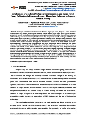 Yuliati, Yuliati, Purnamasari, Puji Endah and Atu, Annisa Fatmawati (2024) Development of Gondosuli coffee network expansion and Puspo forest honey cultivation in Pasuruan Regency throughout Indonesia to improve family economy. International Journal of Economics, Management and Accounting, 1 (3). pp. 446-454. ISSN 3048-0396