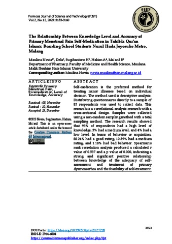 The relationship between knowledge level and accuracy of primary menstrual pain self-medication in Tahfidz Qur'an Islamic Boarding School students Nurul Huda Joyosuko Metro, Malang.