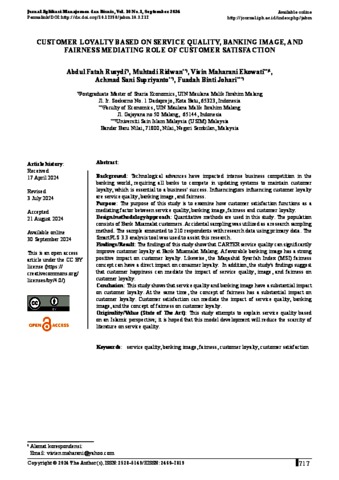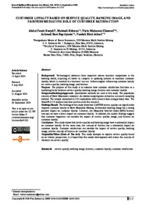 Conclusion: This study shows that service quality and banking image have a substantial impact on customer loyalty. At the same time, the concept of fairness has a substantial impact on customer loyalty. Customer satisfaction can mediate the impact of service quality, banking image, and the concept of fairness on customer loyalty.