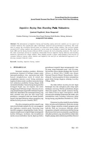 Maghfiroh, Qonitatul and Mangestuti, Retno (2024) Impulsive buying dan hoarding pada mahasiswa. Forum Bisnis dan Kewirausahaan, 13 (2). pp. 431-436. ISSN 2777-094X