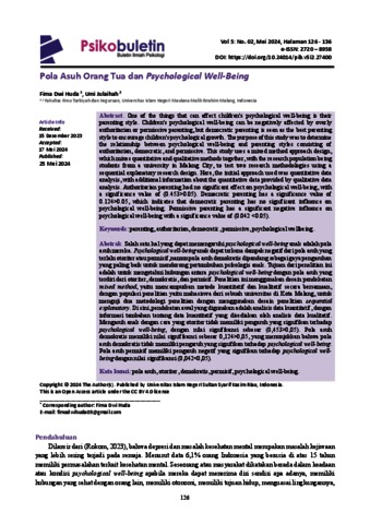 Salah satu hal yang dapat memengaruhi psychological well-being anak adalah pola asuh mereka. Psychological well-being anak dapat terkena dampak negatif dari pola asuh yang terlalu otoriter atau permisif, namun pola asuh demokratis dipandang sebagai gaya pengasuhan yang paling baik untuk mendorong pertumbuhan psikologis anak. Tujuan dari penelitian ini adalah untuk mengetahui hubungan antara psychological well-being dengan pola asuh yang terdiri dari otoriter, demokratis, dan permisif. Penelitian ini menggunakan desain pendekatan mixed method, yaitu mencampurkan metode kuantitatif dan kualitatif secara bersamaan, dengan populasi penelitian yaitu mahasiswa dari sebuah universitas di Kota Malang, untuk menguji dua metodologi penelitian dengan menggunakan desain penelitian sequential explanatory. Di sini, pendekatan awal yang digunakan adalah analisis data kuantitatif, dengan informasi tambahan tentang data kuantitatif yang disediakan oleh analisis data kualitatif. Mengasuh anak dengan cara yang otoriter tidak memiliki pengaruh yang signifikan terhadap psychological well-being, dengan nilai signifikansi sebesar (0,453>0,05). Pola asuh demokratis memiliki nilai signifikansi sebesar 0,124>0,05, yang menunjukkan bahwa pola asuh demokratis tidak memiliki pengaruh yang signifikan terhadap psychological well-being. Pola asuh permisif memiliki pengaruh negatif yang signifikan terhadap psychological wellbeing dengan nilai signifikansi (0,042<0,05).