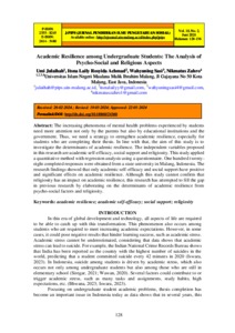The increasing phenomena of mental health problems experienced by students need more attention not only by the parents but also by educational institutions and the government. Thus, we need a strategy to strengthen academic resilience, especially for students who are completing their thesis. In line with that, the aim of this study is to investigate the determinants of academic resilience. The independent variables proposed in this research are academic self-efficacy, social support and religiosity. This study applied a quantitative method with regression analysis using a questionnaire. One hundred twenty-eight completed responses were obtained from a state university in Malang, Indonesia. The research findings showed that only academic self-efficacy and social support have positive and significant effects on academic resilience. Although this study cannot confirm that religiosity has an impact on academic resilience, this research has attempted to fill the gap in previous research by elaborating on the determinants of academic resilience from psycho-social factors and religiosity.