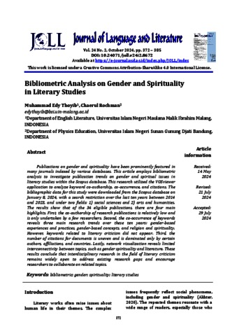 Publications on gender and spirituality have been prominently featured in many journals indexed by various databases. This article employs bibliometric analysis to investigate publication trends on gender and spiritual issues in literary studies within the Scopus database. This research utilized the VOSviewer application to analyze keyword co-authorship, co-occurrence, and citations. The bibliographic data for this study were downloaded from the Scopus database on January 8, 2024, with a search restriction over the last ten years between 2014 and 2023, and under two fields: 1) social sciences and 2) arts and humanities. The results show that of the 34 eligible publications, there are four main highlights. First, the co-authorship of research publications is relatively low and is only undertaken by a few researchers. Second, the co-occurrence of keywords reveals three main research trends over these ten years: gender-based experiences and practices, gender-based concepts, and religion and spirituality. However, keywords related to literary criticism did not appear. Third, the number of citations for documents is uneven and is dominated only by certain authors, affiliations, and countries. Lastly, network visualization reveals limited interconnectivity between topics, such as gender spirituality and literature. These results conclude that interdisciplinary research in the field of literary criticism remains widely open to address existing research gaps and encourage researchers to collaborate on related topics.