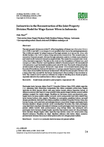 Rouf, Abd. (2024) Jurimetrics in the reconstruction of the joint property division model for Wage-Earner Wives in Indonesia. Al-Ahkam, 34 (1). pp. 1-32. ISSN 2502-3209