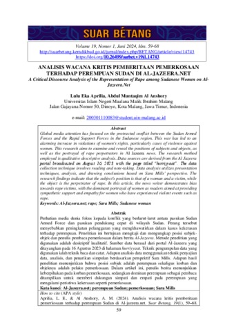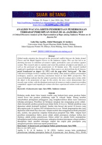 Aprilia, Lulu Eka and Anshory, Abdul Muntaqim Al (2024) Analisis wacana kritis pemberitaan pemerkosaan terhadap perempuan sudan di al-jazeera.net. Suar Betang, 19 (1). ISSN 2686-4975