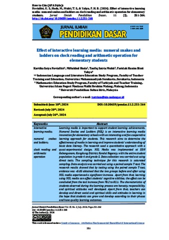 Noviafitri, Kartika Satya, Huda, Miftakhul, Mukti, Taufiq Satria and Yahya, Faridah Hanim Binti (2024) Effect of interactive learning media: Numeral snakes and ladders on clock reading and arithmetic operation for elementary students. Jurnal Ilmiah Pendidikan Dasar, 11 (2). pp. 251-264. ISSN 2685-211X