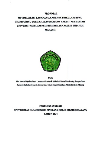 Ami, Sunik, Mahmudi, Zaenul, Muttahidah, Muttahidah, Fahruddin, Ali, Tohir, Ahmad, Nofandika, Fifi Framelia and Mardiana, Mardiana (2024) Optimalisasi layanan akademik sirkulasi buku monitoring dengan scanbarcode Fakultas Syariah Universitas Islam Negeri Maulana Malik Ibrahim Malang. UIN Maulana Malik Ibrahim Malang. (Unpublished)