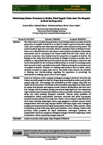 Hakim, Imamul, Zenrif, Muchammad, Ridwan, Muhtadi and Saiban, Kasuwi (2024) Maintaining marine ecosystem to realize halal supply chain from the Maqāsid al-Sharī‘ah perspective. Al-Tahrir: Jurnal Pemikiran Islam, 24 (2). pp. 51-64. ISSN 1412-7512