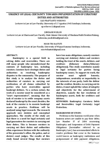 Bankruptcy is a special field in solving debts and receivables. There are still many people who misunderstand the contents of bankruptcy law, including curators. Curators have strategic duties and authorities in resolving bankruptcy disputes in the community. The purpose of this study is to analyze the duties and authorities of curators in carrying out verification of all claims submitted by parties who have receivables against bankrupt debtors. To a certain extent, the work of a curator must be considered as a “court representative”, meaning that the task of curator is to settle company assets declared bankrupt by the court. Besides, the task of the curator is to execute bankrupt assets in practice. Problems will be analyzed using legal research. The research approach uses statutes and conceptual approaches. The results of the study are that there is a need for legal certainty and legal guarantees for curators in carrying out their duties. This is because curators in carrying out their duties and authorities often experience friction with the authority of the prosecutor's office, the police, and or district court judges. The results of this study found several things that curators have two main obligations, namely curators carrying out statutory duties and curators holding the trust of the courts, debtors, and creditors (fiduciary duties/fiduciary obligations). This study contributes mainly to legal certainty for parties facing bankruptcy issues. To support its work, the curator must uphold honesty, independence, neutrality or impartiality in the interests of one party, both the debtor and the creditor. Besides, in carrying out its duties, it must uphold the values of integrity and objectivity for the achievement of objectives, namely the fair resolution of bankruptcy assets, both for creditors and debtors.
