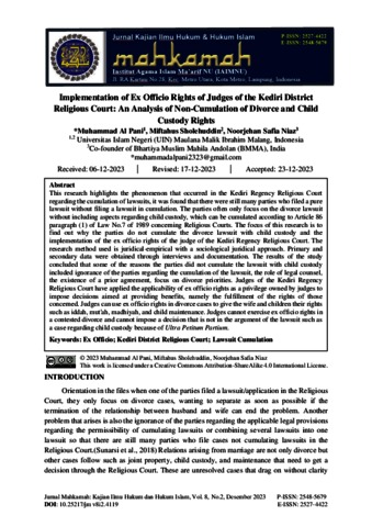 This research highlights the phenomenon that occurred in the Kediri Regency Religious Court regarding the cumulation of lawsuits, it was found that there were still many parties who filed a pure lawsuit without filing a lawsuit in cumulation. The parties often only focus on the divorce lawsuit without including aspects regarding child custody, which can be cumulated according to Article 86 paragraph (1) of Law No.7 of 1989 concerning Religious Courts. The focus of this research is to find out why the parties do not cumulate the divorce lawsuit with child custody and the implementation of the ex officio rights of the judge of the Kediri Regency Religious Court. The research method used is juridical-empirical with a sociological juridical approach. Primary and secondary data were obtained through interviews and documentation. The results of the study concluded that some of the reasons the parties did not cumulate the lawsuit with child custody included ignorance of the parties regarding the cumulation of the lawsuit, the role of legal counsel, the existence of a prior agreement, focus on divorce priorities. Judges of the Kediri Regency Religious Court have applied the applicability of ex officio rights as a privilege owned by judges to impose decisions aimed at providing benefits, namely the fulfillment of the rights of those concerned. Judges can use ex officio rights in divorce cases to give the wife and children their rights such as iddah, mut'ah, madhiyah, and child maintenance. Judges cannot exercise ex officio rights in a contested divorce and cannot impose a decision that is not in the argument of the lawsuit such as a case regarding child custody because of Ultra Petitum Partium.