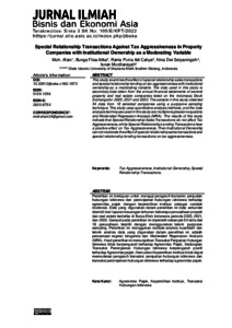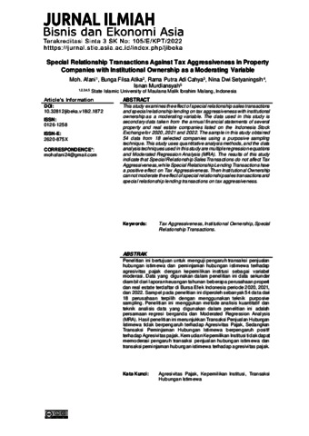 Afani, Moh., Atika, Bunga Filsa, Cahya, Rama Putra Adi, Setyaningsih, Nina Dwi and Murdiansyah, Isnan (2024) Special relationship transactions against tax aggressiveness in property companies with institutional ownership as a moderating variable. Jurnal Ilmiah Bisnis dan Ekonomi Asia, 18 (2). pp. 149-159. ISSN 0126-1258