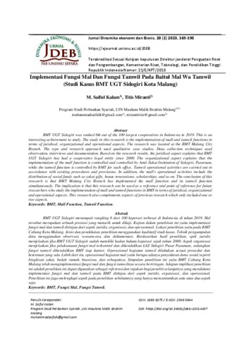 Implementasi fungsi mal dan fungsi tamwil pada Baitul Mal Wa Tamwil: Studi kasus BMT UGT Sidogiri Kota Malang.