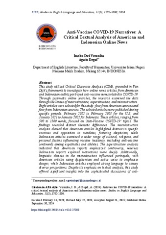 This study utilized Critical Discourse Analysis (CDA), grounded in Van Dijk’s framework to investigate how online news articles from American and Indonesian outlets portrayed anti-vaccine views related to COVID-19. Through systematic online searches, the research examined the data through the lenses of macrostructure, superstructure, and microstructure. Eight articles were selected for this study: four from American sources and four from Indonesian sources. The selected articles were published during specific periods: February 2022 to February 2023 for the U.S., and January 2021 to January 2022 for Indonesia. These articles, ranging from 500 to 1500 words, focused on ‘Anti-Vaccine COVID-19’ topics. The findings revealed distinct thematic differences. The macrostructure analysis showed that American articles highlighted distrust in specific vaccines and opposition to mandates, fostering skepticism, while Indonesian articles examined a wider range of cultural, religious, and personal factors influencing vaccine hesitancy, including anti-vaccine sentiments among expatriates and athletes. The superstructure analysis indicated that American reports emphasized controversy, whereas Indonesian reports explored motivations more deeply. Additionally, linguistic choices in the microstructure influenced portrayals, with American articles using dysphemism and active voice to emphasize danger, while Indonesian articles employed strong language to convey diverse perspectives. Despite its emphasis on textual analysis, this study offered significant insights into the sophisticated discussions of anti-vaccine sentiments in the context of the COVID-19 pandemic, as reflected in American and Indonesian online news.