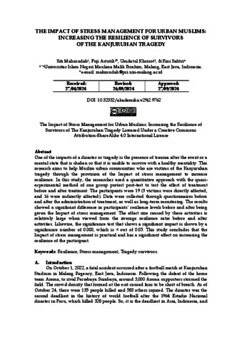 One of the impacts of a disaster or tragedy is the presence of trauma after the event or a mental state that is shaken so that it is unable to survive with a healthy mentality. This research aims to help Muslim urban communities who are victims of the Kanjuruhan tragedy through the provision of the Impact of stress management to increase resilience. In this study, the researcher used a quantitative approach with the quasi-experimental method of one group pretest post-test to test the effect of treatment before and after treatment. The participants were 19 (3 victims were directly affected, and 16 were indirectly affected). Data were collected through questionnaires before and after the administration of treatment, as well as long-term monitoring. The results showed a significant difference in participants’ resilience levels before and after being given the Impact of stress management. The effect size caused by these activities is relatively large when viewed from the average resilience ratio before and after activities. Likewise, the significance test that shows a significant impact is shown by a significance number of 0.000, which is < out of 0.05. This study concludes that the Impact of stress management is practical and has a significant effect on increasing the resilience of the participant.