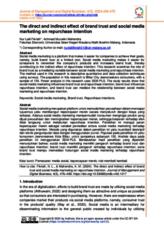 Fikriah, Nur Laili (2024) The direct and indirect effect of brand trust and social media marketing on repurchase intention. Journal of Management and Digital Business. ISSN 2797-9555