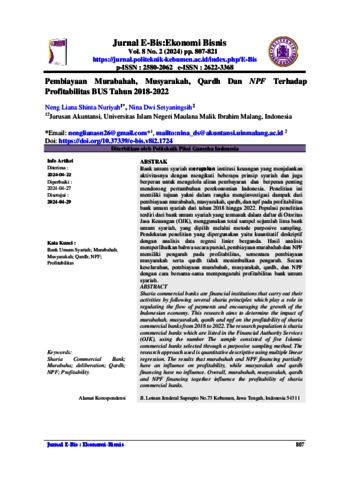 Nuriyah, Ning Liana Shinta and Setyaningsih, Nina Dwi (2024) Pembiayaan murabahah, musyarakah, qardh dan NPF terhadap profitabilitas BUS Tahun 2018-2022. Jurnal E-Bis:Ekonomi Bisnis, 8 (2). pp. 807-821. ISSN 2580-2062