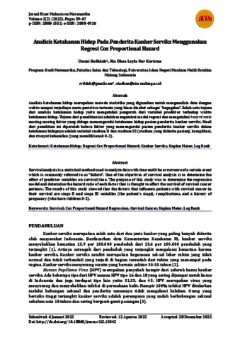 Survival analysis is a statistical method used to analyze data with time until the occurrence of a certain event which is commonly referred to as "failure". One of the objectives of survival analysis is to determine the effect of predictor variables on survival time. The purpose of this study was to determine the regression model and determine the hazard ratio of each factor that is thought to affect the survival of cervical cancer patients. The results of this study showed that the factors that influence patients with cervical cancer in their survival are stage II and stage III variables (the patient’s stage), complications, and a history of pregnancy (who have children 0-2).