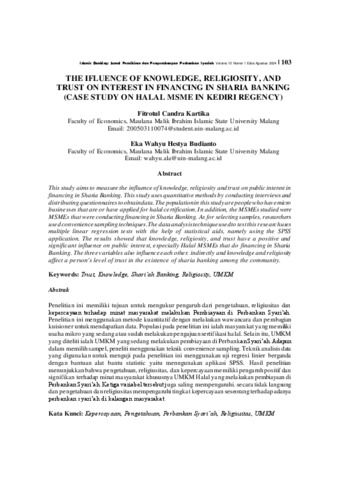 The influence of knowledge, religiosity, and trust on interest in financing in sharia banking: Case study on halal MSME in Kediri regency.