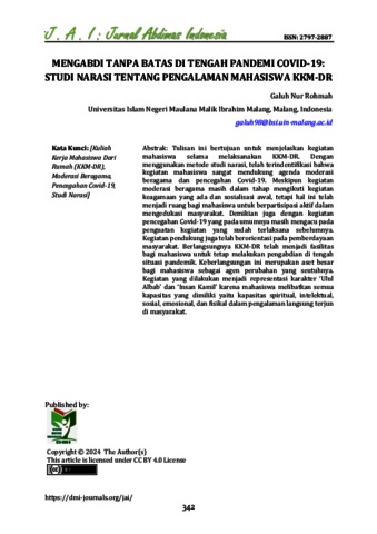 Rohmah, Galuh Nur (2024) Mengabdi tanpa batas di tengah Pandemi Covid-19: Studi narasi tentang pengalaman mahasiswa KKM-DR. JAI: Jurnal Abdimas Indonesia, 4 (2). pp. 342-351. ISSN 2797-2887
