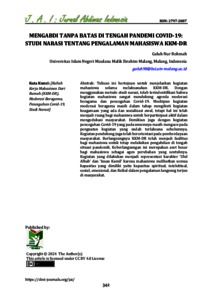 Tulisan ini bertujuan untuk menjelaskan kegiatan mahasiswa selama melaksanakan KKM-DR. Dengan menggunakan metode studi narasi, telah terindentifikasi bahwa kegiatan mahasiswa sangat mendukung agenda moderasi beragama dan pencegahan Covid-19. Meskipun kegiatan moderasiberagama masih dalam tahap mengikuti kegiatan keagamaan yang ada dan sosialisasi awal, tetapi hal ini telah menjadi ruang bagi mahasiswa untuk berpartisipasi aktif dalam mengedukasi masyarakat. Demikian juga dengan kegiatan pencegahan Covid-19 yang pada umumnya masih mengacu pada penguatan kegiatan yang sudah terlaksana sebelumnya. Kegiatan pendukung juga telah berorientasi pada pemberdayaan masyarakat. Berlangsungnya KKM-DR telah menjadi fasilitas bagi mahasiswa untuk tetap melakukan pengabdian di tengah situasi pandemik. Keberlangsungan ini merupakan aset besar bagi mahasiswa sebagai agen perubahan yang seutuhnya. Kegiatan yang dilakukan menjadi representasi karakter ‘Ulul Albab’ dan ‘Insan Kamil’ karena mahasiswa melibatkan semua kapasitas yang dimiliki yaitu kapasitas spiritual, intelektual, sosial, emosional, dan fisikal dalam pengalaman langsung terjun di masyarakat.