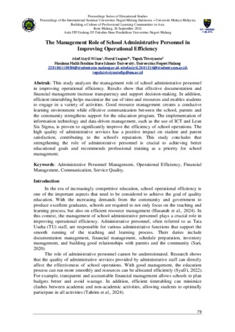 This study analyzes the management role of school administrative personnel in improving operational efficiency. Results show that effective documentation and financial management increase transparency and support decision-making. In addition, efficient timetabling helps maximize the use of time and resources and enables students to engage in a variety of activities. Good resource management creates a conducive learning environment while effective communication between the school, parents and the community strengthens support for the education program. The implementation of information technology and data-driven management, such as the use of ICT and Lean Six Sigma, is proven to significantly improve the efficiency of school operations. The high quality of administrative services has a positive impact on student and parent satisfaction, contributing to the school's reputation. This study concludes that strengthening the role of administrative personnel is crucial to achieving better educational goals and recommends professional training as a priority for school management.