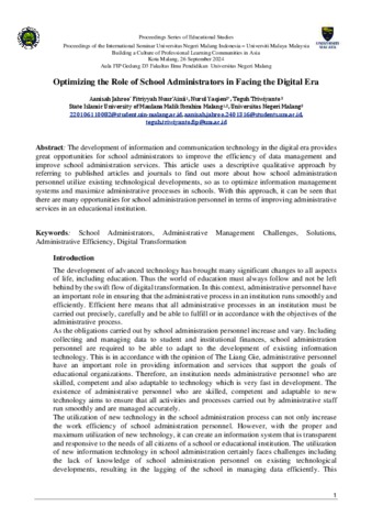 Nuur’Ainii, Aanisah Jahroo’ Fitriyyah, Yaqien, Nurul and Triwiyanto, Teguh (2024) Optimizing the role of school administrators in facing the digital era. Presented at International Seminar Universitas Negeri Malang Indonesia – Universiti Malaya Malaysia, 26 September 2024, Malang.