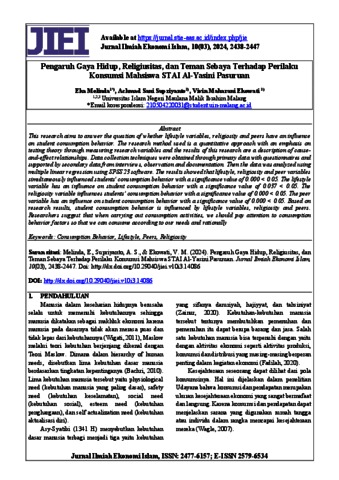 Pengaruh gaya hidup, religiusitas, dan teman sebaya terhadap perilaku konsumsi mahsiswa STAI Al-Yasini Pasuruan.