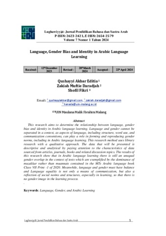 This research aims to determine the relationship between language, gender bias and identity in Arabic language learning. Language and gender cannot be separated in a context, as aspects of language, including structure, word use, and communication conventions, can play a role in forming and reproducing gender norms, including in Arabic language learning. This research method uses library research with a qualitative approach. The data that will be presented is descriptive and analytical by paying attention to the characteristics of data sourced from articles, journals, books and related discussion topics. The results of this research show that in Arabic language learning there is still an unequal gender overlap in the context of texts which are exemplified by the dominance of muzakkar rather than muannats contained in the MTs Arabic language book Class VII Print -1 of 2020. Meanwhile, language and gender must have balance and Language equality is not only a means of communication, but also a reflection of social norms and structures, especially in learning, so that there is no gender image in the learning process.